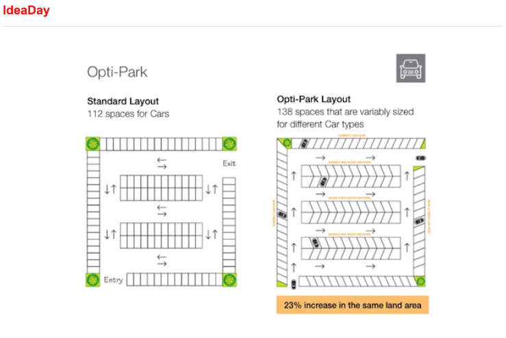 After experiencing the intelligent elevators, the idea came to Bill to do the same thing for parking lots and parking decks. Imagine pulling up to a parking lot gate, a computer instantly calculating the dimensions of your car, and issuing a slip of paper to park in a designated spot (e.g. D4). Upon receiving the slip of paper, the driver knows exactly where to go and doesn’t drive around aimlessly until they encounter the first open spot, which may or may not fit their car. Of course, the big benefit is striping the lines of the parking deck for a variety of car sizes such that it can hold several more cars (in Bill’s example he cites one lot being able to hold 23% more cars). Eventually, the lot can be designed to not have any painted stripes but rather have LED lights that can change dynamically to maximize parking efficiency — so many amazing opportunities.