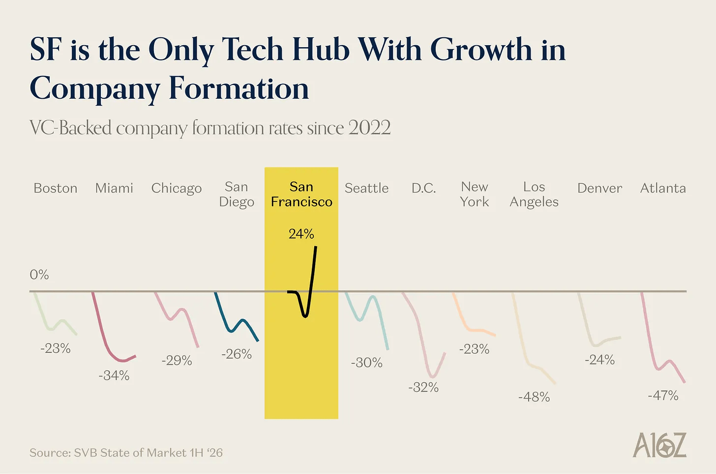 Silicon Valley Bank recently published a report analyzing the growth and decline of VC-backed startups since 2022 across the largest metro regions in the United States. Using 2022 as the baseline year, the data shows that, across nearly every major market outside the San Francisco Bay Area, the number of newly VC-backed startups has dropped sharply. In places like Atlanta and Los Angeles, the number is down nearly 50 percent.