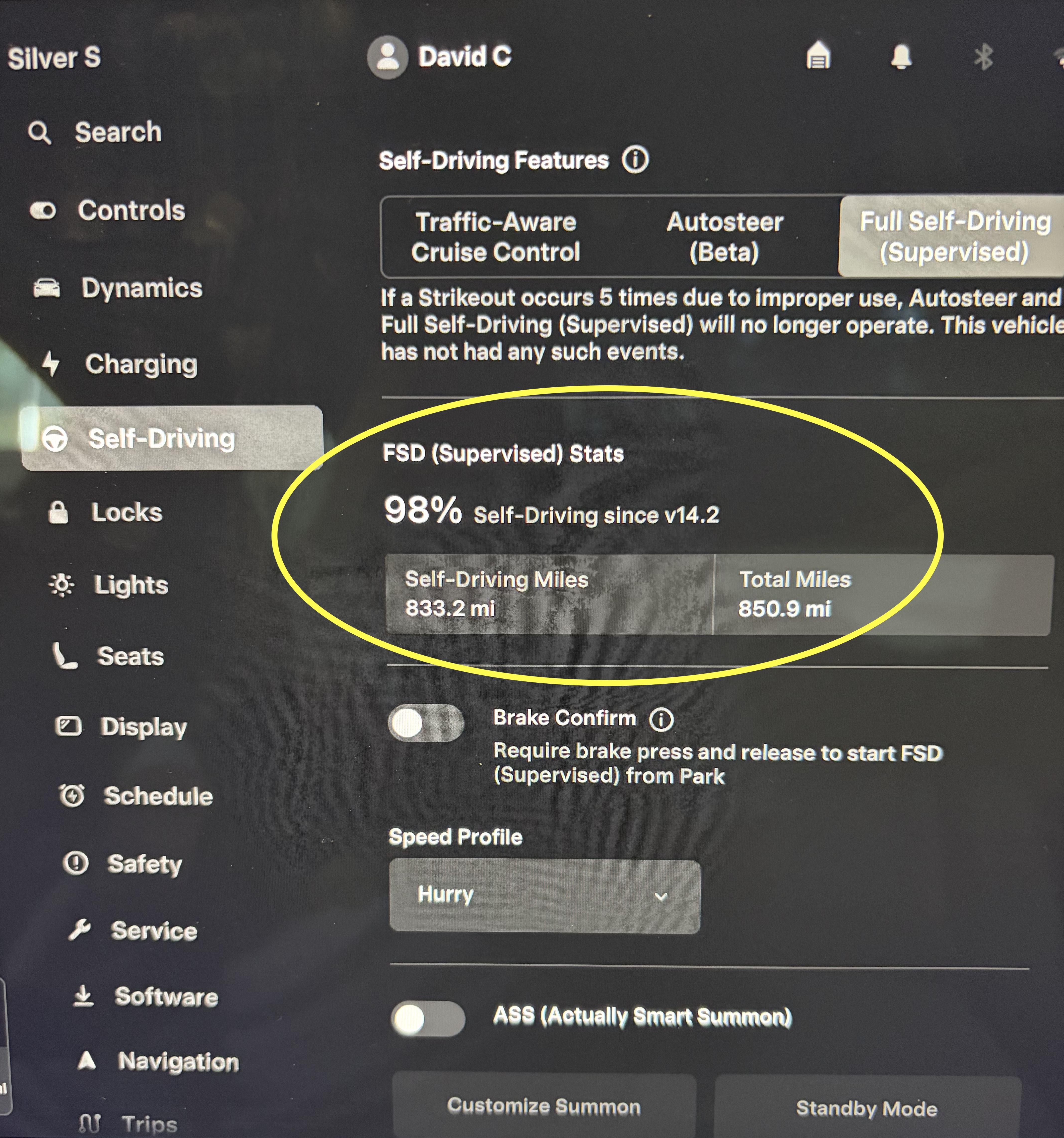 Based on the onboard computer’s data, over the last 850 miles I’ve driven, 98% of those miles were on Full Self-Driving. What about the other 2%? Google Maps. All routing depends on Google Maps, and there are a few spots where the chosen route isn’t as efficient as alternatives, so I occasionally override it with brief manual driving. Outside of these mapping issues, it’s truly a sit-back-and-enjoy-the-ride experience.