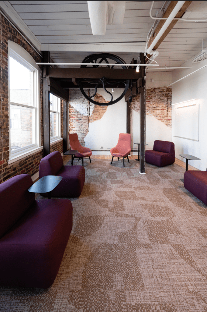 Initially, I suggested the retail space on the right side of the building because it was closer to the center of the block. However, I was quickly shown that the retail space on the left side of the building, directly across the hall from Spiller Park Coffee, was a more natural entrance for ATV. Now, we have a beautiful street-level entrance with a lobby, reception, and small event space. Upstairs, the building features 40+ private offices, several conference and board rooms, multiple kitchens, and another event space that can accommodate 50 to 75 people comfortably.